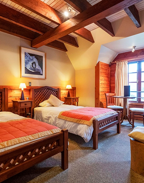 Dos camas individuales, decoración rústica, ofrecen confort sureño. Vista directa a bosques nativos de coihues.