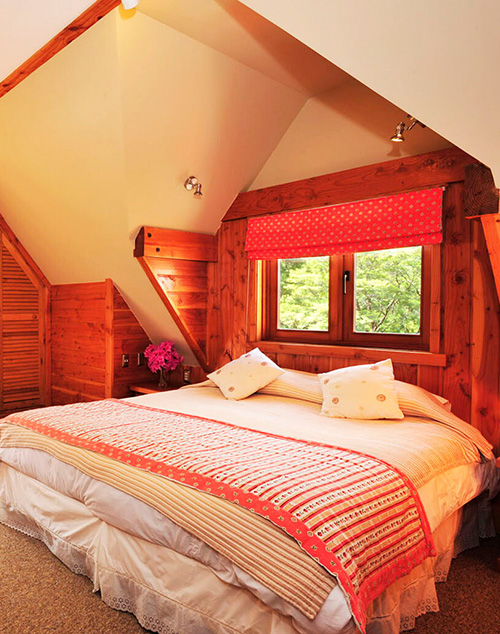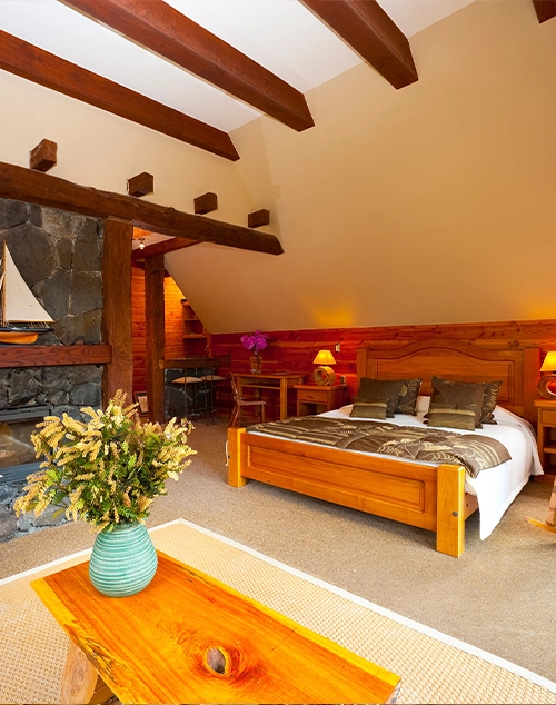 Habitación con cama matrimonial, decoración rústica de madera. Vista a bosques nativos de coihues.