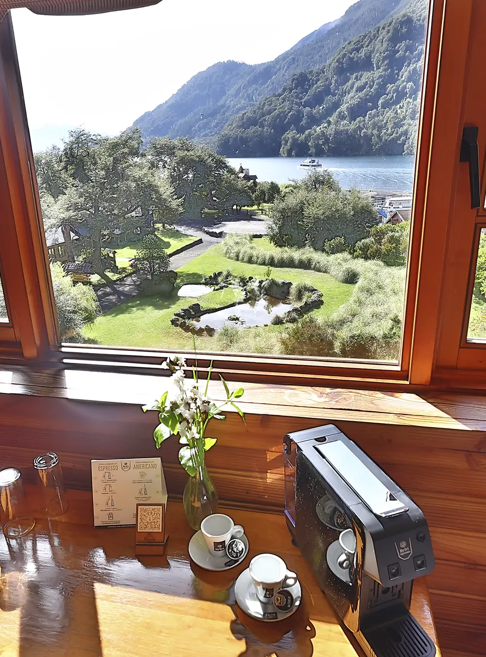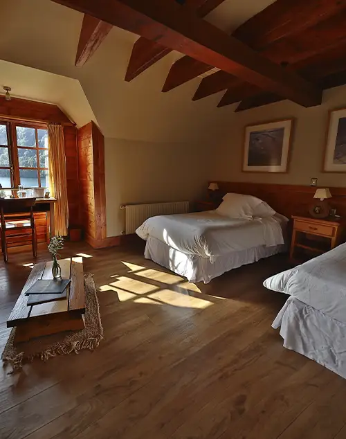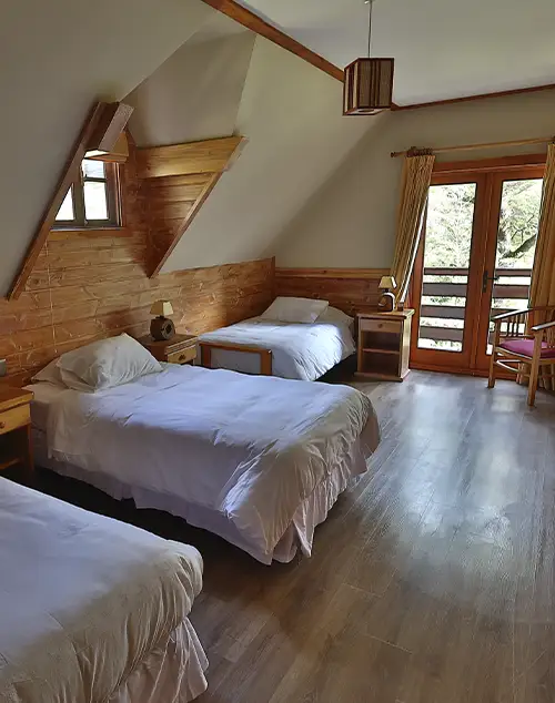 Dos camas individuales, ambiente confortable. Vista al Lago Todos los Santos y a la Sierra Santo Domingo.