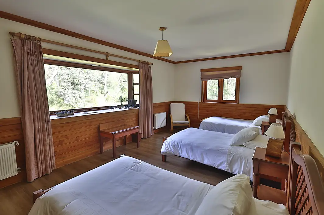 Dos camas individuales, decoración rústica, ofrecen confort sureño. Vista directa a bosques nativos de coihues.