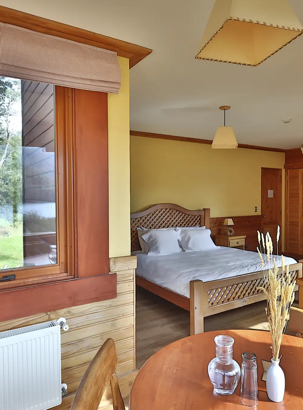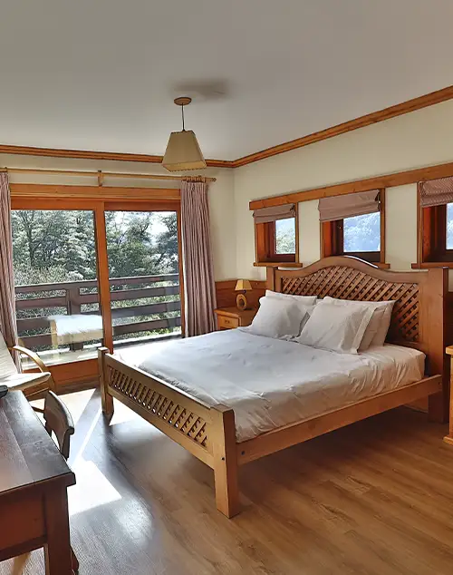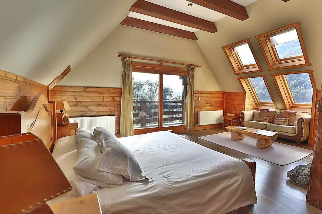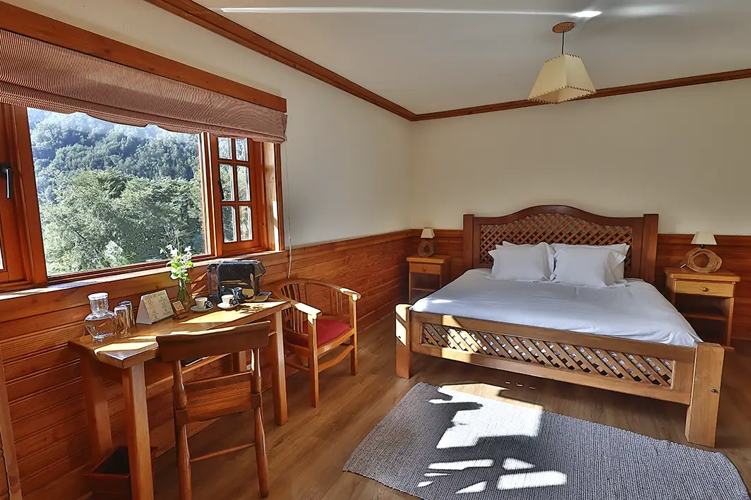Habitación con cama matrimonial, decoración rústica de madera. Vista a bosques nativos de coihues.