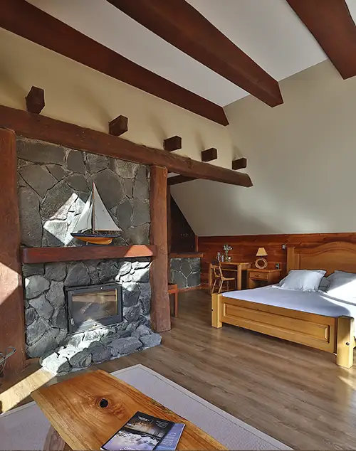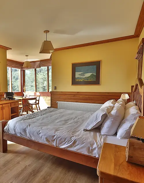 Cama King, ambiente rustico y  confortable. Vista al Lago Todos los Santos y a la Sierra Santo Domingo.